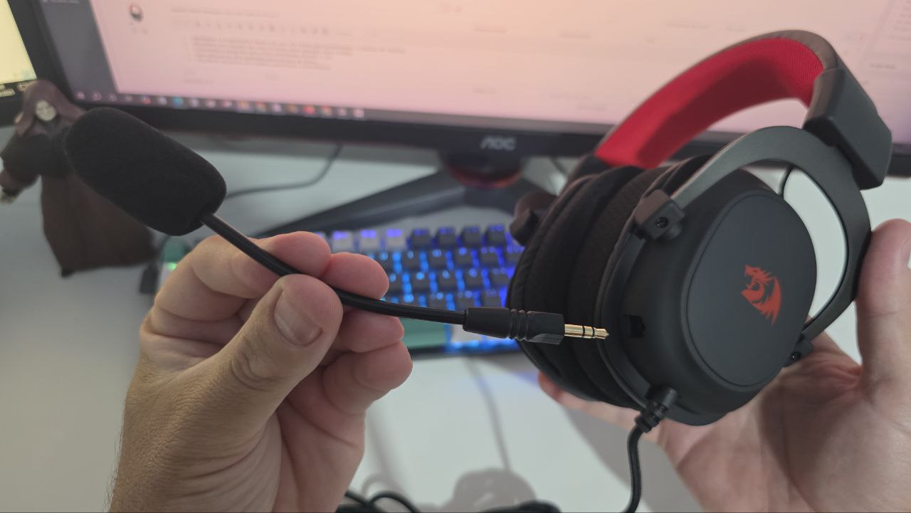 Outro ponto forte do Redragon Zeus Lite é o microfone removível com redução de ruído. Durante os testes, minha voz foi captada de forma clara, sem interferências externas — mesmo com ventilador e ruídos de fundo próximos.